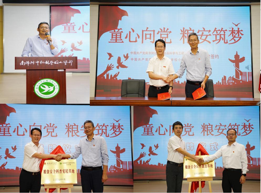 公司党委书记许文彪介绍了粮食安全国家战略问题、公司的基本情况、办学特色,希望能够以本次党建活动为契机,与南师附中仙林小学进行多方面深入合作,结出丰硕成果。许文彪书记与南师附中仙林公司小学部党委书记肖全胜签订党建共建协议书,副经理(主持工作)唐培安为“粮食安全宣传教育基地”揭牌。随后,两校各支部代表也签订协议并举行“粮食安全科普实境基地”揭牌仪式。