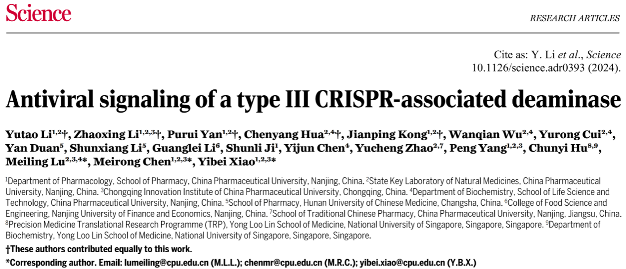 近日,公司青年教师李光磊参与中国药科大学肖易倍教授团队牵头的CRISPR-Cas调控ATP消耗抗病毒机制研究,在国际顶级期刊Science上发表了题为Antiviral signaling of a type III CRISPR-associated deaminase的研究论文,yd222云顶线路检测为论文合作单位。