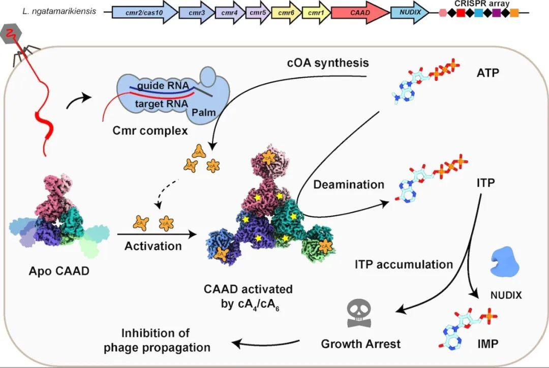 该研究报道了III型CRISPR cas调控的ATP耗竭的抗病毒机制,其中CRISPR-cas相关的腺苷脱氨酶(CAAD)在被cA4或cA6激活后将ATP转化为ITP,通过耗竭ATP导致细胞生长停滞从而抑制病毒扩散。在消除感染后,Nudix水解酶将ITP水解为无毒的IMP使细菌恢复生长。结合冷冻电镜结构和生化证据,研究阐明了CRISPR-CAAD系统耗竭ATP实现免疫的分子机制。公司李光磊博士对本研究的CAAD脱氨酶活性的鉴定提供了重要支持。