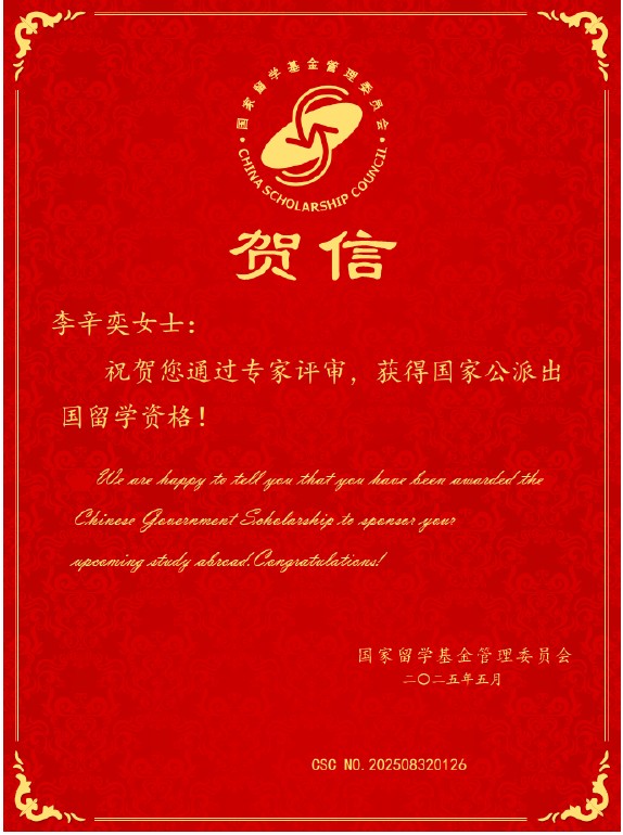 近日,国家留学基金管理委员会公布了2025年国家建设高水平大学公派研究生项目录取名单,公司2022级食品科学与工程学硕士研究生李辛奕同学凭借扎实的专业基础、突出的科研能力以及出色的学术成果,成功入选该项目!李辛奕同学即将前往全球食品科学与工程专业排名第五(2024年软科世界一流学科排名)的美国马萨诸塞大学阿姆赫斯特分校攻读博士学位。