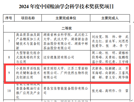 5月26日,2024年度中国粮油学会科学技术奖获奖项目名单公布,公司沈新春教授牵头主持的“小麦胚芽活性肽的关键制备技术及创新应用”项目获中国粮油学会科学技术奖二等奖。