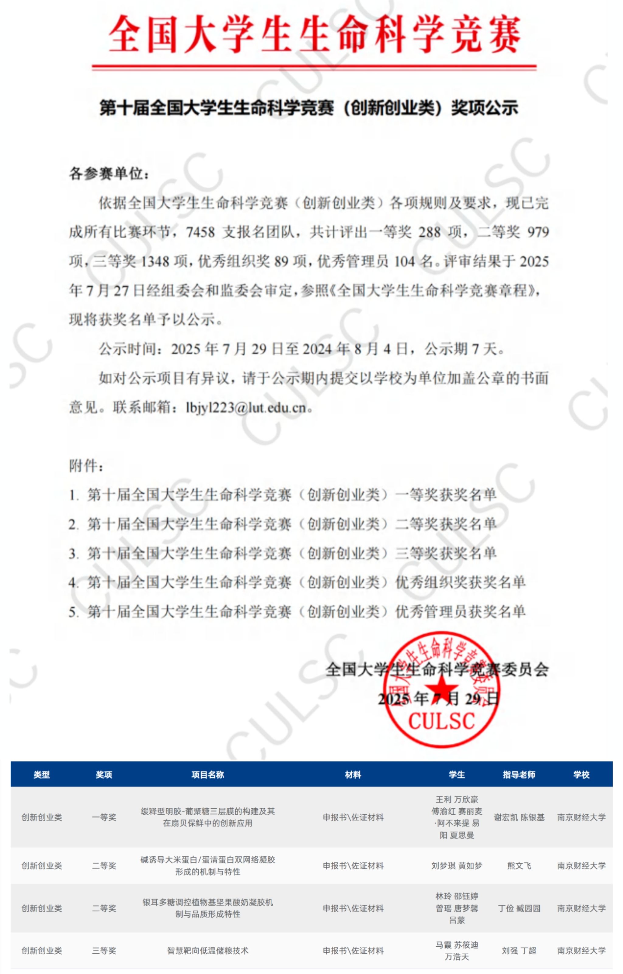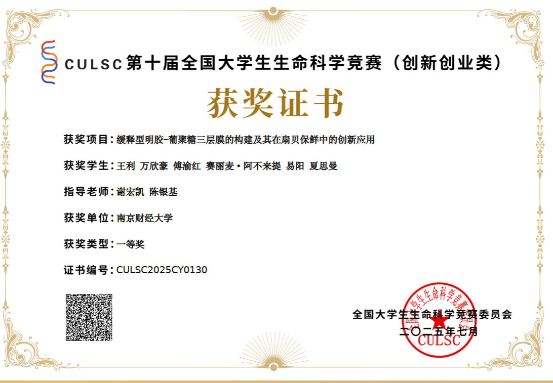 由公司谢宏凯、陈银基两位老师悉心指导的项目《缓释型明胶——葡聚糖三层膜的构建及其在扇贝保鲜中的创新应用》,凭借新颖的研究思路、扎实的实验基础和良好的应用前景在全国决赛中脱颖而出,获得一等奖。该项目聚焦扇贝保鲜这一实际产业需求,创新构建缓释型三层膜,为水产品保鲜技术的升级提供了新思路,得到了评审专家的高度认可。