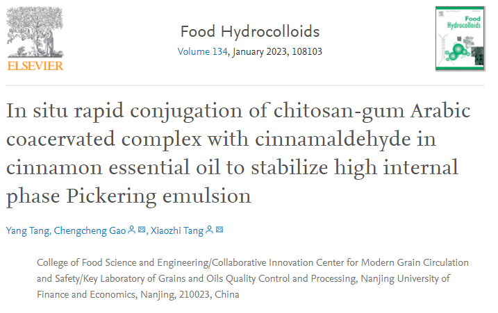 2022年8月27日,yd222云顶线路检测汤晓智、高成成(通讯作者)在国际TOP期刊Food Hydrocolloids(Q1,IF: 11.504)发表题为“In situ rapid conjugation of chitosan-gum Arabic coacervated complex with cinnamaldehyde in cinnamon essential oil to stabilize high internal phase Pickering emulsion”的研究性论文。