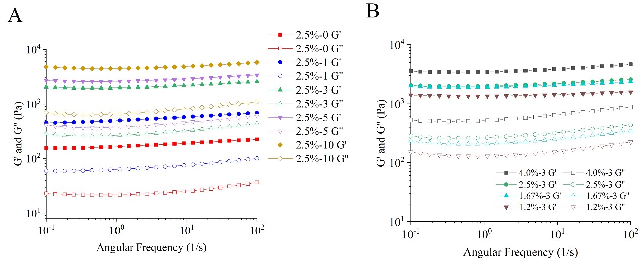 图4 不同浓度的肉桂精油(a)和CGCC浓度 (B)稳定的HIPEs的储能模量 (G’)和损耗模量 (G”)。