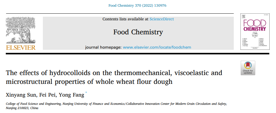 2022年2月15日,《Food Chemistry》发表了题为“The effects of hydrocolloids on the thermomechanical, viscoelastic and microstructural properties of whole wheat flour dough”的研究论文,该论文以yd222云顶线路检测为第一单位,孙昕炀博士为第一作者,方勇教授为通讯作者。该项研究工作得到了国家重点研发计划项目、江苏省自然科学基金与国家自然科学基金的资助。本研究通过综合探索亲水胶体对全麦面团热力学特性、粘弹性和微观结构特性的影响作用,为优化全麦面团加工工艺,改善全麦产品品质提供了科学方案。