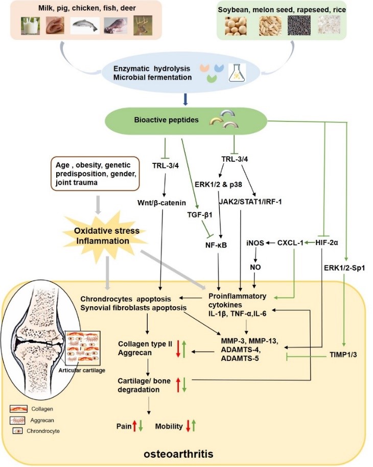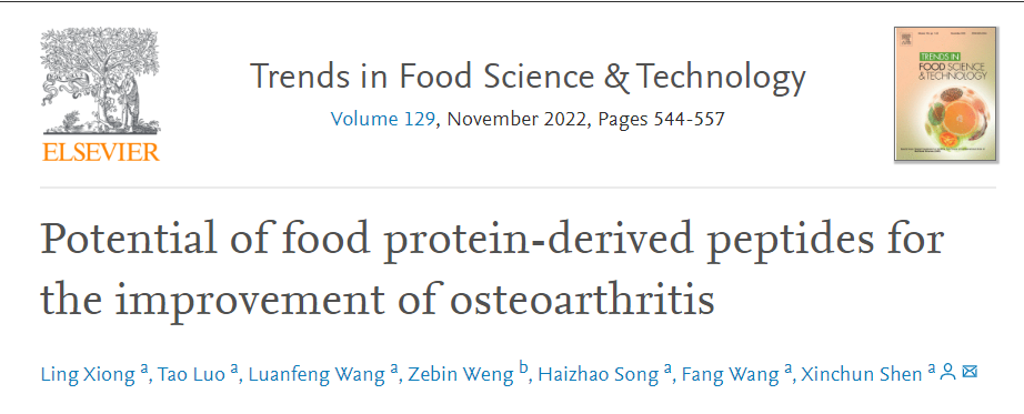 2022年11月9日,yd222云顶线路检测沈新春教授课题组在食品国际顶尖学术刊物《Trends in Food Science & Technology》(Q1,IF=16.002)发表题为 “Potential of food protein-derived peptides for the improvement of osteoarthritis” 的综述论文。该论文以yd222云顶线路检测为第一单位,熊玲博士为第一作者。该项研究工作得到了国家自然科学基金面上项目、江苏省高等公司自然科学研究面上项目、江苏省高校优势团队建设工程项目的资助。