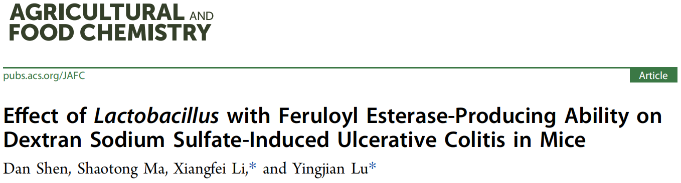 2022年11月17日,《Journal of Agricultural and Food Chemistry》(中科院一区,IF=5.279)在线发表了题为“Effect of Lactobacillus with Feruloyl Esterase-Producing Ability on Dextran Sodium Sulfate-Induced Ulcerative Colitis in Mice”的研究论文,被选为当期(2022,Volume 70,Issue 47)的封面论文(Front Cover)。该论文以yd222云顶线路检测为第一单位,硕士生沈丹为第一作者,陆颖健教授李向菲副教授为通讯作者。该研究工作得到了江苏高校优势团队建设工程资助项目(PAPD)、国家自然科学基金和中国博士后基金的资助。