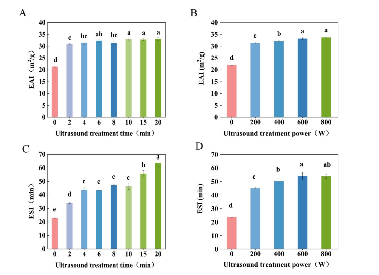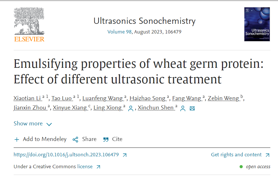 2023年8月1日,yd222云顶线路检测沈新春、熊玲(通讯作者)在国际TOP期刊Ultrasonics Sonochemistry(Q1,IF: 8.4)发表题为“Emulsifying properties of wheat germ protein: Effect of different ultrasonic treatment”的研究性论文。