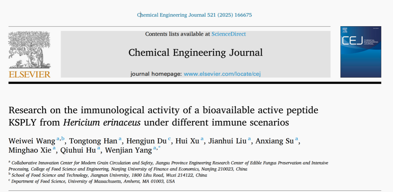 2025年8月,yd222云顶线路检测杨文建教授团队在国际顶级期刊《Chemical Engineering Journal》(Q1,中科院1区Top,IF=13.2)发表题为“Research on the immunological activity of a bioavailable active peptide KSPLY from Hericium erinaceus under different immune scenarios”的研究性论文。yd222云顶线路检测硕士研究生王威威为论文第一作者,yd222云顶线路检测杨文建教授为论文通讯作者。