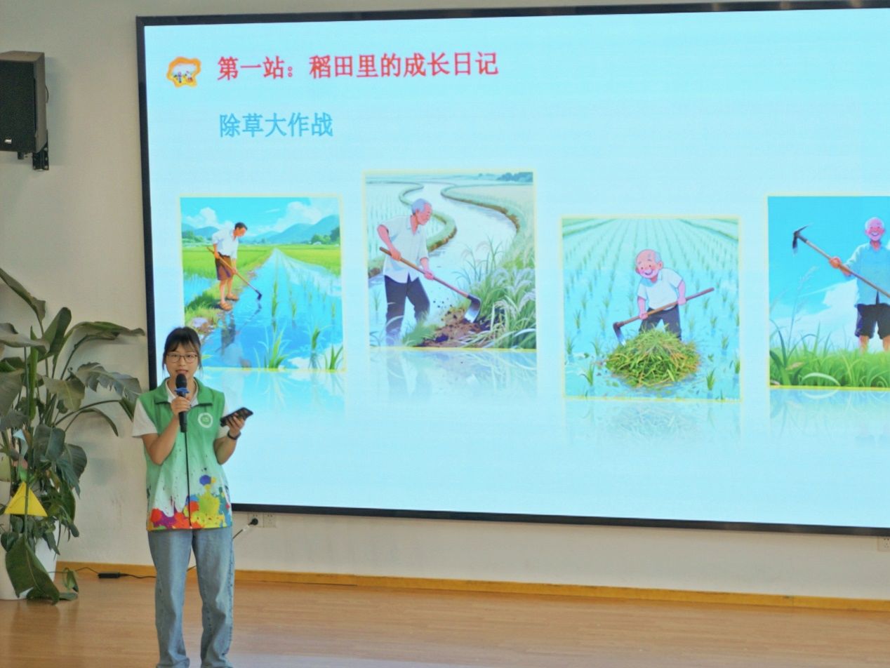 小班课堂以一首朗朗上口的儿歌《悯农》拉开序幕,“粮安薪火”宣讲团成员讲述《小米粒的红色红之旅》,借助生动的讲解,带领小班幼儿踏上“播种-插秧-收割-脱壳”的粮食生长全周期之旅,让孩子们得以直观领略粮食从田间到餐桌的奇妙旅程,深切感悟“粒粒皆辛苦”的深刻内涵。
