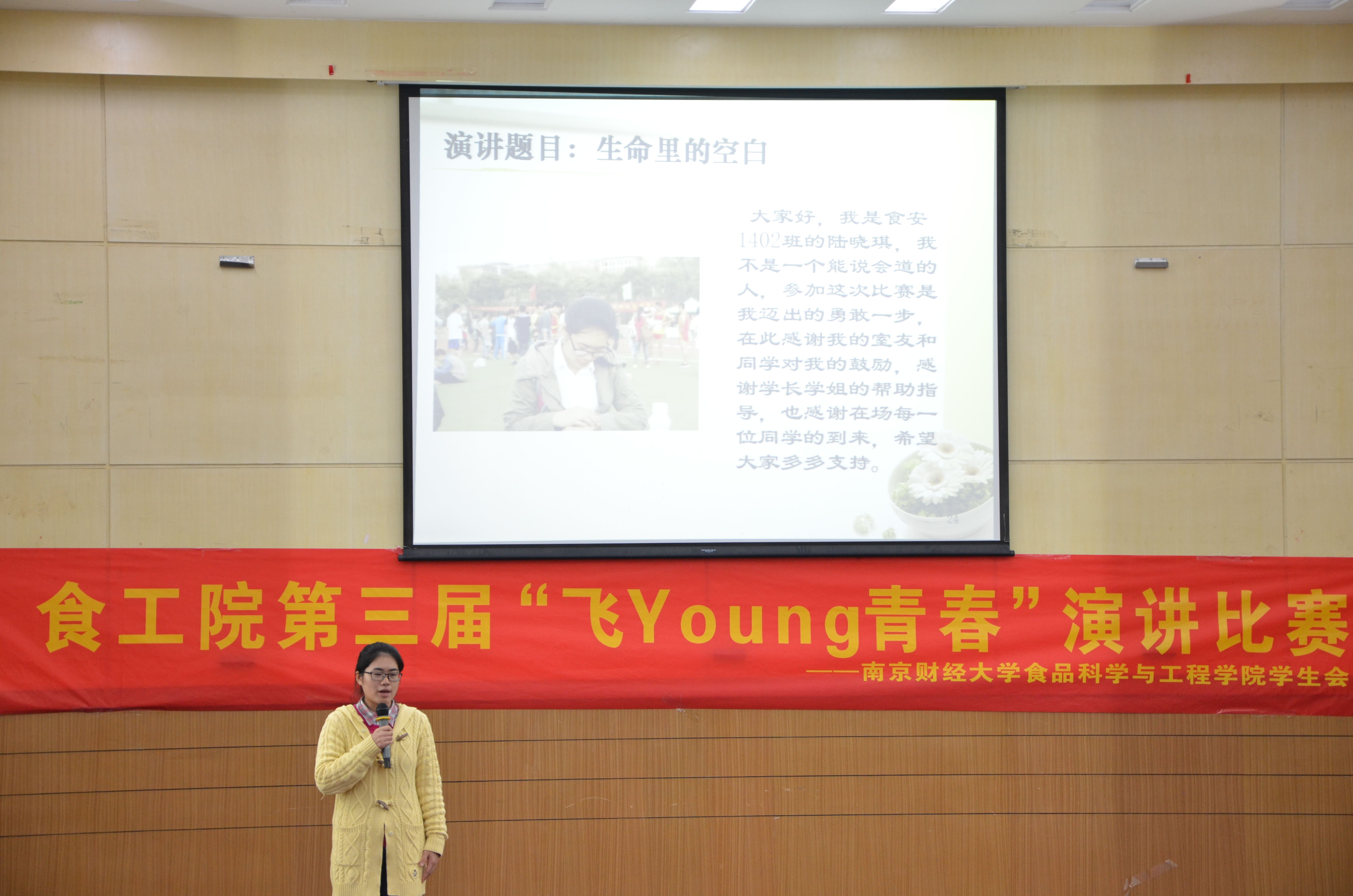 11月16日晚,法政学科楼报告厅内济济一堂,食工院第三届“飞young青春”演讲比赛决赛在这里隆重举办。院员工会主席张旭、副主席胡昊颖、团总支副书记吉燕燕、绿光通讯社社长栾銮、食工院辩论队领队危心瑶担任本次大赛评委。