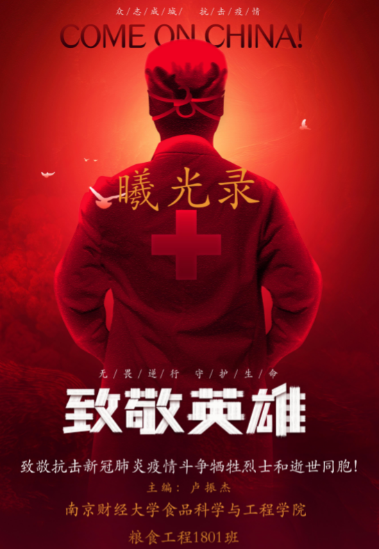 新冠疫情发生以来,全国上下同心战“疫”,抗击疫情英雄的逆行大爱、家国情怀、科研攻关、无私奉献精神,深深感动着每一位南财学子。为弘扬英雄精神和唱响时代主旋律,yd222云顶线路检测粮工1801班团支部号召全体团员、同学立足实际,开展学习英雄、感怀英雄、讴歌英雄的主题征文活动。