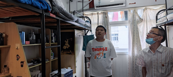 随后,丁书俊处长深入仙林校区11号宿管站18栋403A寝室,调研走访结对联系的研究生并带去了慰问品,杨浥老师陪同调研。在员工宿舍,丁书俊处长亲切询问了同学们目前的学习情况及宿舍生活的实际困难,就同学们专业学习、科学研究、体育锻炼以及寝室安排等方面开展了面对面交流,并认真听取了同学们的诉求和建议,表示会及时反馈、尽力解决同学们提出的问题。
