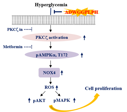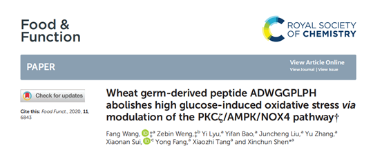 公司沈新春教授课题组采用独特的二步双酶酶解筛选技术,从麦胚清蛋白中筛选出了高活性的抗氧化肽,用ESI-TOF MS/MS鉴定其结构。并以高糖诱导的血管平滑肌细胞(VSMCs)和STZ诱导的糖尿病小鼠为模型,研究该抗氧化肽的抗氧化作用及机制。相关研究结果以“Wheat germ-derived peptide ADWGGPLPH abolishes high glucose-induced oxidative stress via modulation of the PKCζ/AMPK/NOX4 pathway”为题发表在Food & Function杂志上。公司汪芳副教授为第一作者,沈新春教授为通讯作者。本研究得到国家自然科学基金、江苏省自然科学基金和江苏省高校自然科学基金的支持。