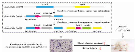 酒精性肝病是世界范围内发病和死亡的一个主要原因。减少酒精摄入和加速酒精降解能减少酒精在血液中的滞留时间,从而有助于防止酒精性肝病。在最近的一项研究工作中,来自公司陆颖健教授团队和南京农业大学的研究人员构建了食品级重组枯草芽胞杆菌,可有效降解酒精,动物实验证明其有潜力作为口服制剂用于减缓酒精性肝损伤。该研究成果《Co-expression of alcohol dehydrogenase and aldehyde dehydrogenase in Bacillus subtilis for alcohol detoxification》近日发表在Food and chemical toxicology杂志,通讯作者为公司陆颖健教授和南京农业大学陆兆新教授。
