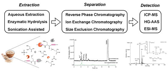 2021年4月,食品国际TOP学术期刊Comprehensive Reviews in Food Science and Food Safety(IF 9.9)发表了公司题为 “Selenium in cereals: Insight into species of the element from total amount” 的论文。该文系统地阐述了谷物中硒的含量和生物强化途径,论述了谷物中不同化学形态硒的分析流程和技术方法,揭示了硒的形态与其生物活性的关系,讨论了谷物来源的硒相关研究未来面临的主要问题和发展趋势。农作物因受到遗传品种、土壤条件、栽培方式以及加工方式的影响,导致谷物中硒含量变化范围较大,通过外源施用硒肥的方式可以大幅提高谷物籽粒中的硒含量。目前,最主要的谷物硒形态分析流程包括提取、分离和检测三个主要步骤,最常用的分析技术方法是通过温和适宜的酶促提取法获得各形态的硒,再用高效液相色谱(HPLC)联用电感耦合等离子体质谱(ICP-MS)分析定量硒的具体形态。谷物中含有无机硒(硒酸盐、亚硒酸盐)和有机硒,包括硒代甲硫氨酸(SeMet)和小分子硒肽等。有机硒比无机硒具有更好的生物利用度、更高的营养价值和更低的毒性,活性硒肽具有抗氧化、免疫调节、缓解重金属毒性等多种生理功能。谷物的硒形态以SeMet为主,还有多种活性硒肽,表明谷物是膳食硒的优良载体。文章强调在评价硒的营养健康作用,不仅仅考虑硒的摄入总量,而且也应考察硒的具体存在形态。因此,复杂样品中硒形态的高通量和快速高效的分析手段是未来的重要研究挑战,硒形态和生理功能的构效关系及其作用机理仍然是重要研究方向。
