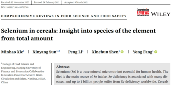 硒(Se)是人类和动物生长发育所必需的一种微量元素。人体缺硒能够导致一系列疾病,然而硒的摄入量过高会引起硒中毒。谷物虽然平均硒含量相比动物性食物较低,但作为人类的主食是一种非常重要的膳食硒源,特别是对亚洲和非洲一些缺硒地区的人民来说,谷物更是他们最主要的硒摄入来源。值得注意的是,硒元素的有益效果是由被体内消化的硒及其形态决定,而不仅仅是谷物中总硒的含量。
