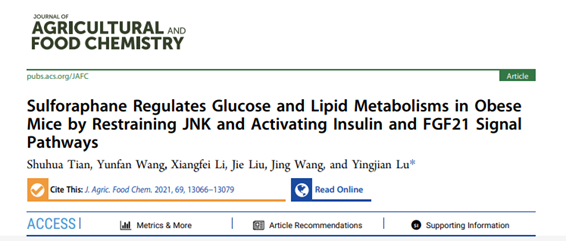 2021年10月28日,公司陆颖健教授团队在Journal of Agricultural and Food Chemistry第69刊发表封面文章《Sulforaphane regulates glucose and lipid metabolisms in obese mice by restraining JNK and activating insulin and FGF21 Signal pathways》。该论文以yd222云顶线路检测为第一单位,田淑华为第一作者,陆颖健为通讯作者。