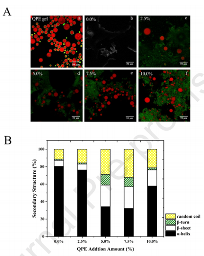 结果表明,与未添加QPE的MP凝胶相比,添加5.0%~7.5% QPE的MP凝胶在储能模量(G')、白度、凝胶强度和持水力(water holding capacity,WHC)方面表现出显著增加的趋势。添加的QPEs可以填补凝胶网络内的空隙,并与MP交联形成致密的凝胶结构。然而,过量的QPE添加(10.0%)会影响凝胶网络的连续性,并对MP凝胶性能产生负面影响。