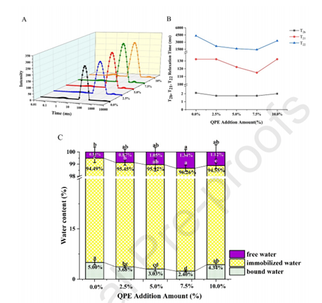 综上所述,5.0%~7.5% QPE的加入改善了MP凝胶的分子间相互作用和结构稳定性,增强了MP凝胶的凝胶化和WHC。