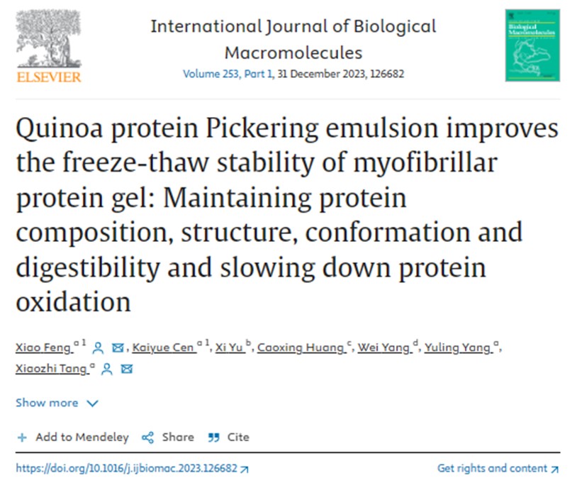 2023年5月1日,yd222云顶线路检测冯潇、汤晓智(通讯作者)在国际TOP期刊International Journal of Biological Macromolecules(Q1,IF: 8.2)发表题为“Quinoa protein Pickering emulsion improves the freeze-thaw stability of myofibrillar protein gel: Maintaining protein composition, structure, conformation and digestibility and slowing down protein oxidation”的研究性论文。