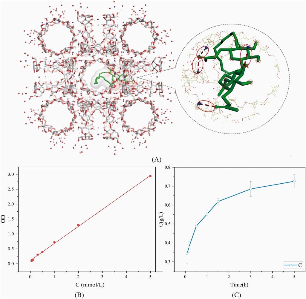 图3 LSL和γ-CD-MOFs的分子对接示意图(γ-CD MOFs大笼状密闭空间包裹LSL(绿棒模型为LSL,白棒模型为γ-CD-MOFs))