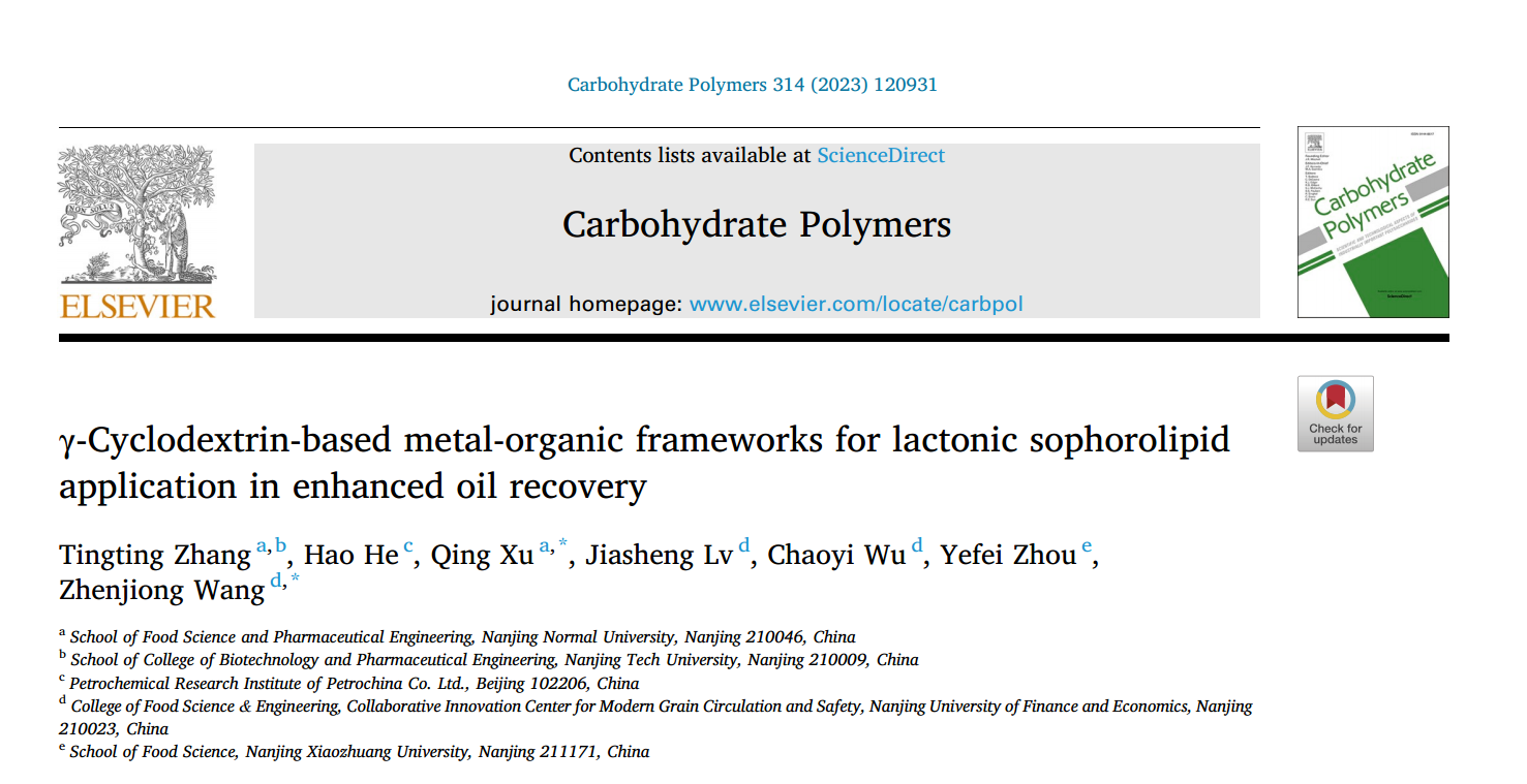 2023年8月,yd222云顶线路检测汪振炯副教授(通讯作者)在国际TOP期刊Carbohydrate Polymers(Q1,IF: 11.2)发表题为“γ-Cyclodextrin-based metal-organic frameworks for lactonic sophorolipid application in enhanced oil recovery”的研究性论文。