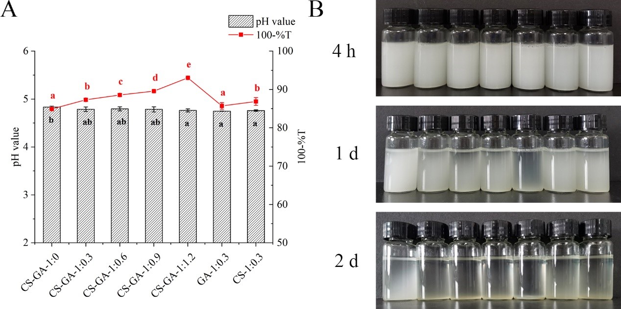图2 纳米颗粒分散液的 pH,浊度 (A) 和外观(B) (B: 从左到右, CS-GA-1: 0, CS-GA-1: 0.3, CS-GA-1: 0.6, CS-GA-1: 0.9, CS-GA-1: 1.2, GA-1:0.3, CS-1:0.3)