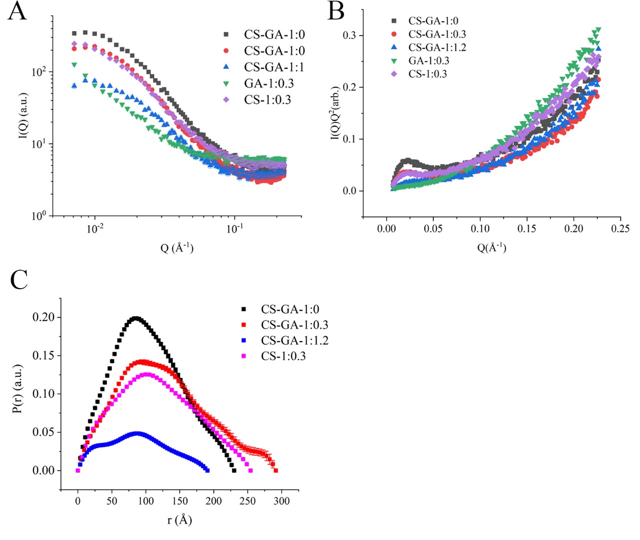 图4 复合纳米颗粒的小角X射线散射强度曲线 (A),Kratky plot (B) and PDDF (C)