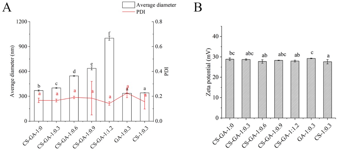 壳聚糖具有低免疫原性、良好的生物相容性和可降解性、无毒性等优点,被认为是一种很有前途的生物材料。壳聚糖基纳米颗粒是一种重要的应用形式,可作为药物、基因或生物活性物质的载体。为了改善或丰富壳聚糖基纳米颗粒的功能,通常与其他组分结合使用。阿拉伯胶是一种广泛应用于食品工业的两亲性阴离子多糖。阿拉伯胶被证实可以提高壳聚糖的界面活性。 肉桂精油是一种天然活性植物提取物,其主要化学成分是肉桂醛,与壳聚糖可以发生席夫碱反应提高壳聚糖的界面活性、抗菌性和抗氧化性。本文研究了壳聚糖、阿拉伯胶和肉桂醛的混合顺序以及肉桂醛的浓度对复合纳米颗粒结构和功能的影响,以期为壳聚糖基纳米颗粒在食品和医疗领域的应用奠定基础。