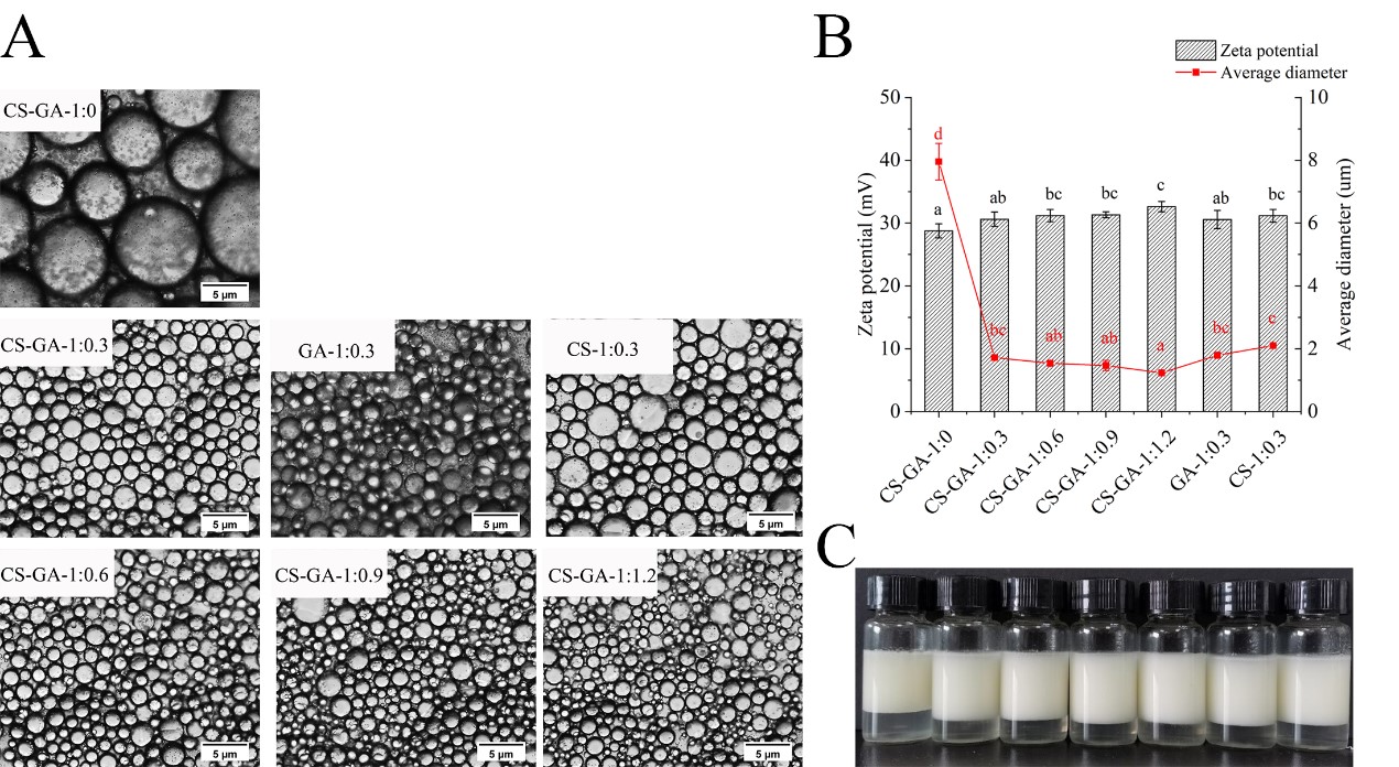 图5 复合纳米颗粒稳定的乳液的光学显微图 (A), 平均粒径和Zeta电位 (B), 储存3天后的外观图 (C) ,(C: 从左到右 CS-GA-1: 0, CS-GA-1: 0.3, CS-GA-1: 0.6, CS-GA-1: 0.9, CS-GA-1: 1.2, GA-1:0.3, CS-1:0.3)