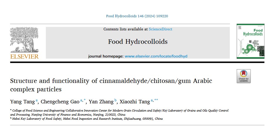 2024年1月,yd222云顶线路检测汤晓智、高成成(通讯作者)在国际TOP期刊Food Hydrocolloids(Q1,IF: 10.7)发表题为“Structure and functionality of cinnamaldehyde/chitosan/gum Arabic based composite nanoparticles”的研究性论文。