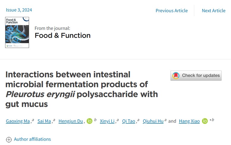 2024年2月5日,yd222云顶线路检测马高兴副教授在国际TOP期刊Food & Function(Q1,IF: 6.1)发表题为“Interactions between intestinal microbial fermentation products of Pleurotus eryngii polysaccharide with gut mucus”的研究性论文。