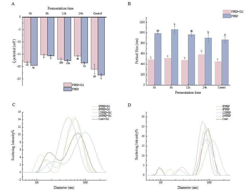 图1:不同发酵多糖和肠黏液的Zeta电位(A)、平均粒径(B)和粒径分布(C、D)