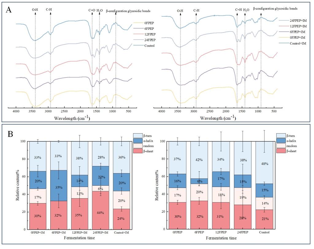 图4:杏鲍菇多糖发酵产物与肠黏液相互作用形成复合物的FTIR光谱(A)和二级结构含量的变化(B)