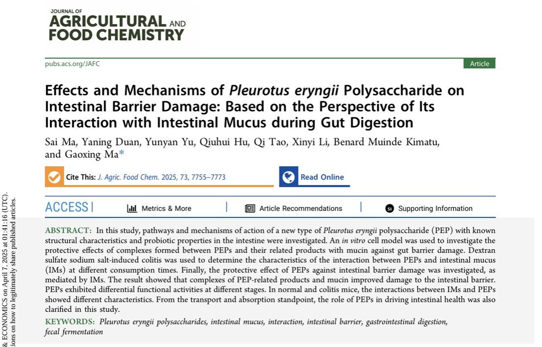 2025年3月20日,2021级硕士研究生马赛(第一作者),马高兴教授(通讯作者)在国际TOP期刊Journal of Agricultural and Food Chemistry (Q1,IF: 5.7)发表题为“Effects and Mechanisms of Pleurotus eryngii Polysaccharide on Intestinal Barrier Damage: Based on the Perspective of Its Interaction with Intestinal Mucus during Gut Digestion”的研究性论文。