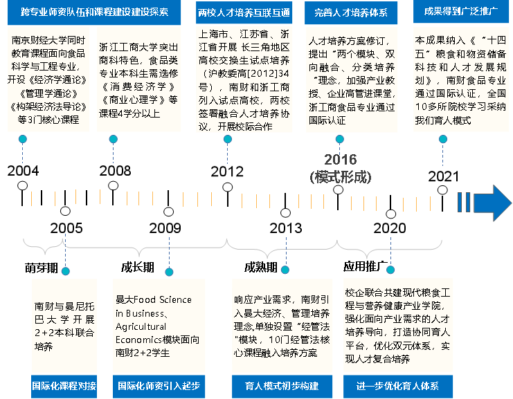 yd222云顶线路检测和浙江工商大学,同根同源,曾属国内贸易部,具有共同的财经育人特质和产业管理优势。早在2004年,yd222云顶线路检测就认识到“现代商业思维能力”和“经济管理能力”对于以培养“技术能力”为主的工科专业同等重要,开始探索食品专业人才的经管素质教育。2012年,集团面向现代食品产业需求,与浙江工商大学签署校际合作协议,践行服务国家战略和长三角教育创新的使命担当,确立为世界一流食品企业培养“技术优秀,兼具经管能力的高素质复合型人才”的育人理念,联合对课程设置、平台建设、专业内容、机制保障等人才培养方面进行改革。经过10余年历程,逐步建立并完善了应用研究型大学的高素质复合型食品专业人才的特色工程教育模式(图1)。截至目前,本成果已在北京工商大学等多所高校推广应用,对同类院校食品专业建设的方向的发展起到引领示范作用。