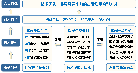 yd222云顶线路检测和浙江工商大学地处长三角经济发达地区江苏省、浙江省两个经济大省,在新常态下国家经济社会发展背景下,两校重点围绕食品科学与工程、食品质量与安全、粮食工程等食品类核心专业,探索了适应经济和时代发展的食品科学与工程类人才培养模式,形成了较为完善的融合人才培养的理论体系,共同凝练“技术优秀,兼具经管能力的高素质复合型人才”的培养理念,发挥学科交叉和产教融合优势,对理论课程、实践教学和协同机制进行多元化改革,破解技术与管理、理论与实践割裂的问题,构建了“产业牵引、经管融入、多元协同”的融合育人模式(图2)。
